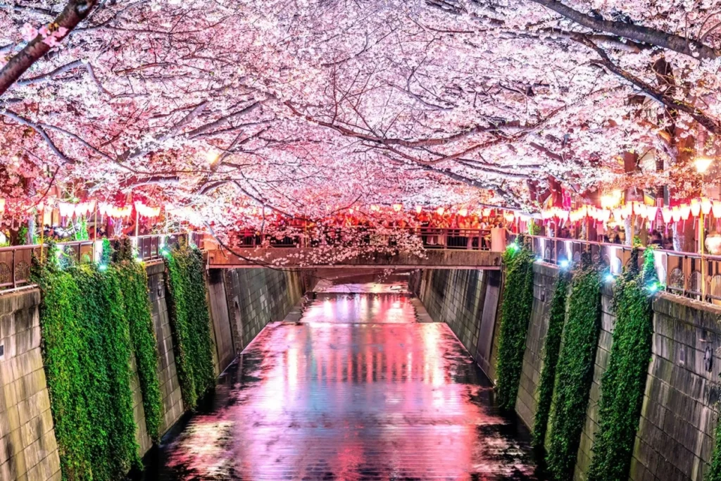 Sông Meguro nổi tiếng với đường hầm hoa anh đào dài hơn 3km, nhờ hơn 800 cây anh đào đồng loạt nở rủ xuống hai bên bờ sông. Vào mùa hoa, khu vực này có lễ hội nhỏ, đèn trang trí buổi tối, không khí nhộn nhịp nhưng vẫn trật tự.  Meguro mang lại trải nghiệm hiện đại, trẻ trung, có gì đó rất “Tokyo”, thu hút những du khách lần đầu du lịch Nhật Bản mùa hoa anh đào. Lịch ngắm hoa tại Meguro thường được sắp xếp vào khung giờ chiều tối, du khách có thể ngắm hoa ban ngày lẫn ban đêm mà không cần di chuyển nhiều.du lịch nhật bản mùa hoa anh đào